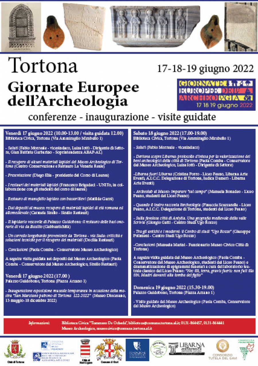 In occasione delle Giornate Europee dell’Archeologia 2022 (17-19 giugno) la città di Tortona (AL), in collaborazione con la Soprintendenza ABAP-AL e con la Direzione Regionale Musei Piemonte, ha programmato una serie di eventi che desiderano far conoscere le iniziative di studio, le attività di restauro e i progetti di valorizzazione che coinvolgono il patrimonio archeologico della Città.