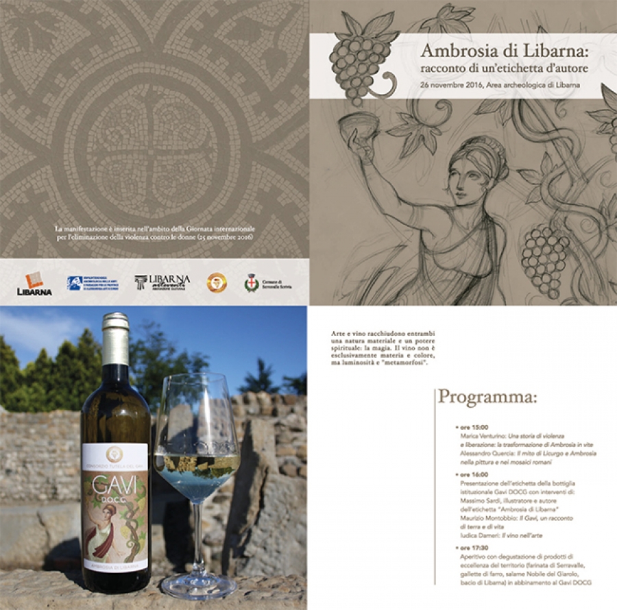 Sabato 26 novembre alle ore 15,00, nella Sala Conferenze dell'Area archeologica di Libarna, sarà protagonista "Ambrosia di Libarna", l'etichetta disegnata dall'illustratore Massimo Sardi e ispirata al mosaico raffigurante il mito di Licurgo e Ambrosia, scelta dal Consorzio Tutela del Gavi per la bottiglia istituzionale di Gavi Docg 2016, in linea con i progetti di valorizzazione volti a legare sempre di più l’antica città romana con il territorio.