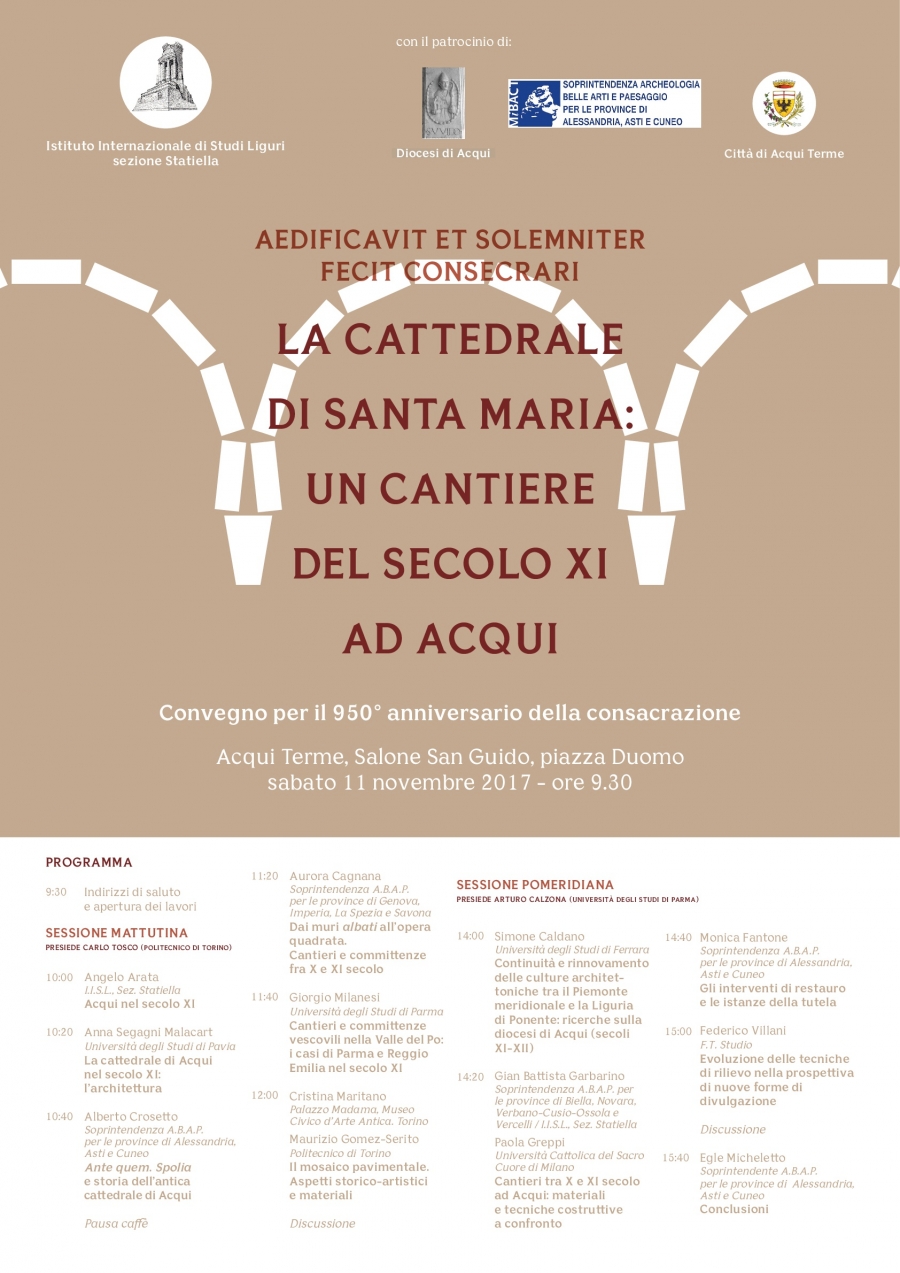 Il momento della consacrazione, che ebbe luogo l’11 novembre del 1067, segna la fine dei lavori di costruzione della cattedrale di Acqui, intitolata dal vescovo Guido a santa Maria, che costituisce una delle più importanti testimonianze dell’architettura romanica dell’Italia nordoccidentale. Gli interventi dei relatori prenderanno in esame caratteristiche e problemi conservativi della fase originaria del millenario edificio. Inoltre, anche attraverso il confronto con altri casi coevi dell’Italia centro-settentrionale, sarà posta l’attenzione sul lungo e complesso cantiere edilizio, avviato all’inizio del secolo XI e protrattosi per alcuni decenni.