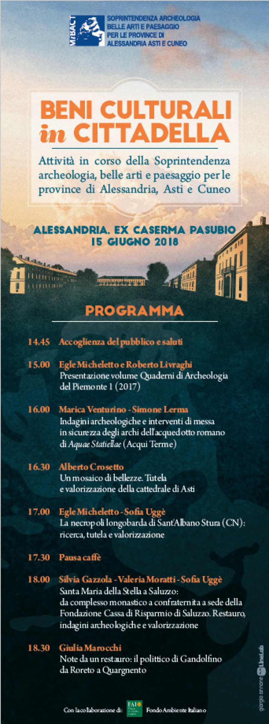 La recente riforma della struttura organizzativa del Ministero dei beni e delle attività culturali e del turismo ha visto anche la creazione delle Soprintendenze uniche con l’accorpamento delle funzioni di tutela archeologica, architettonica, storico artistica e paesaggistica in un’unica struttura, determinando per il Piemonte l’istituzione di tre nuovi uffici e la contestuale soppressione della Soprintendenza archeologica, che aveva competenza sull’intero territorio regionale. Il 14 marzo 2018 la Soprintendenza archeologia, belle arti e paesaggio per le province di Alessandria, Asti e Cuneo ha aperto la sua sede nella Cittadella di Alessandria nell’ex Caserma Pasubio e ha dato inizio a un percorso di collaborazione con la Regione Piemonte e con l’Amministrazione comunale di Alessandria per un piano organico di interventi su questo importante e significativo complesso monumentale. Scopo dell’iniziativa “Beni Culturali in Cittadella”, oltre alla presentazione del primo volume dei Quaderni di Archeologia del Piemonte (2017), storica rivista della Soprintendenza archeologica del Piemonte (1980-2016), nella sua rinnovata veste editoriale, è avviare un dialogo con la città e il territorio per fare conoscere meglio l’attività istituzionale di tutela e valorizzazione dei beni culturali della Soprintendenza nelle sue varie articolazioni funzionali (archeologia, belle arti e paesaggio) e territoriali.